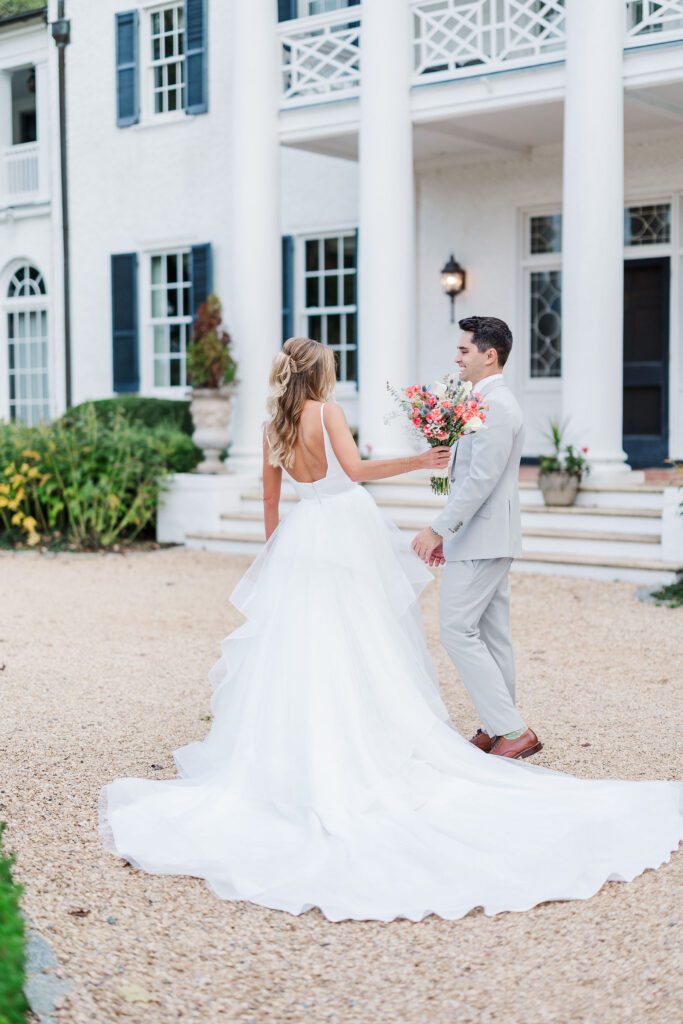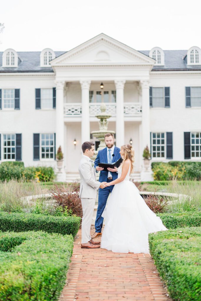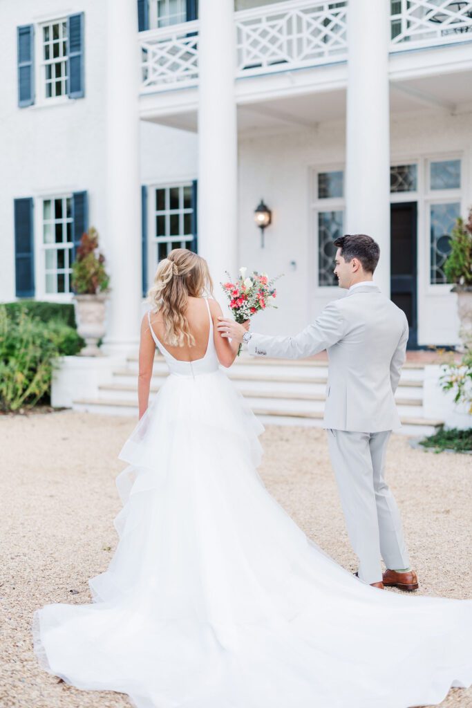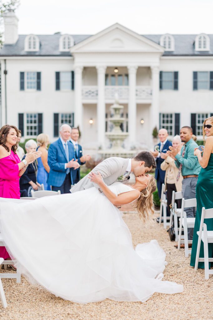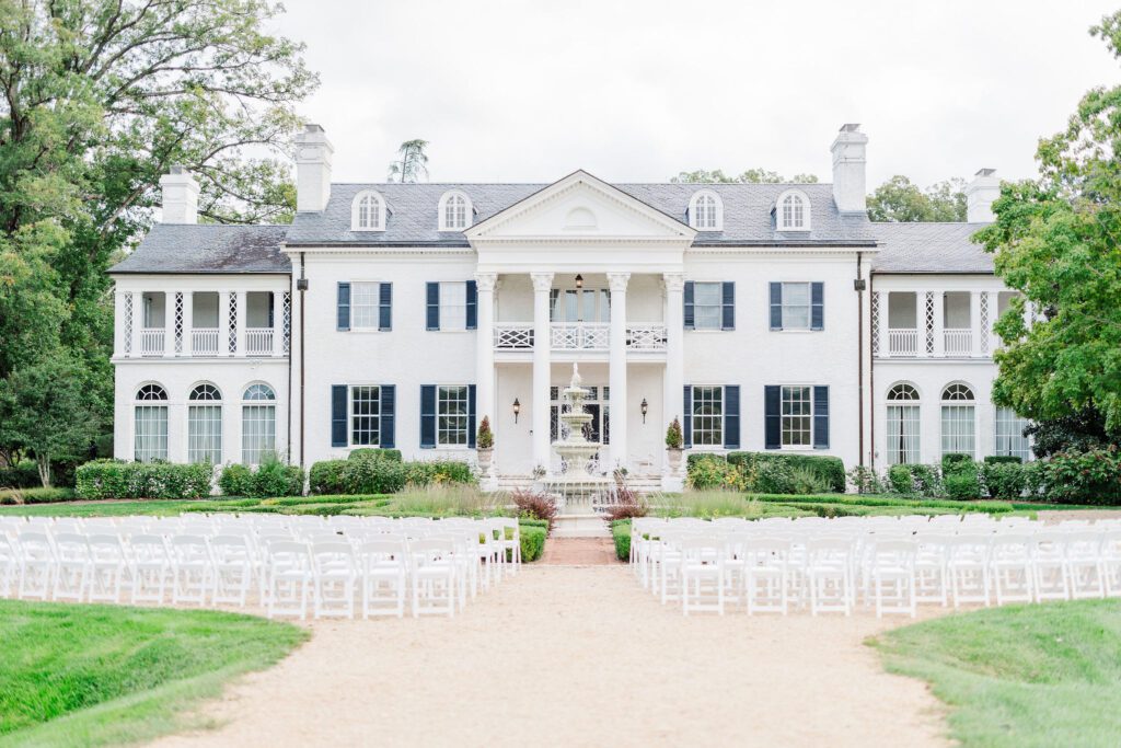 Their ceremony took place right in front of Keswick’s iconic white mansion. Rows of white chairs lined the gravel path, all facing the grand columns and fountain. As Haley walked down the aisle, there wasn’t a dry eye in sight. The scene was classic Virginia elegance — romantic, bright, and timeless.