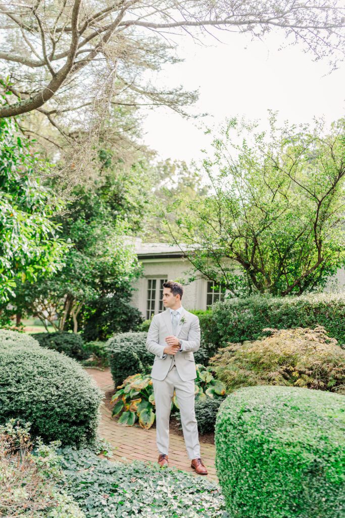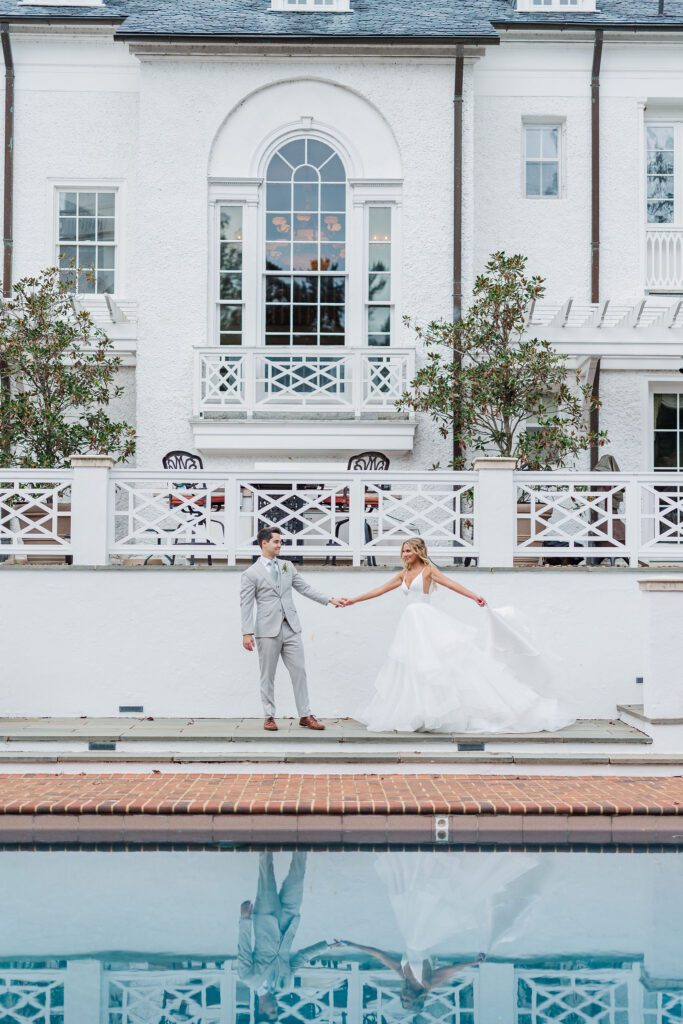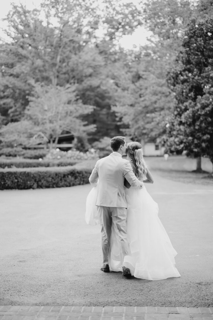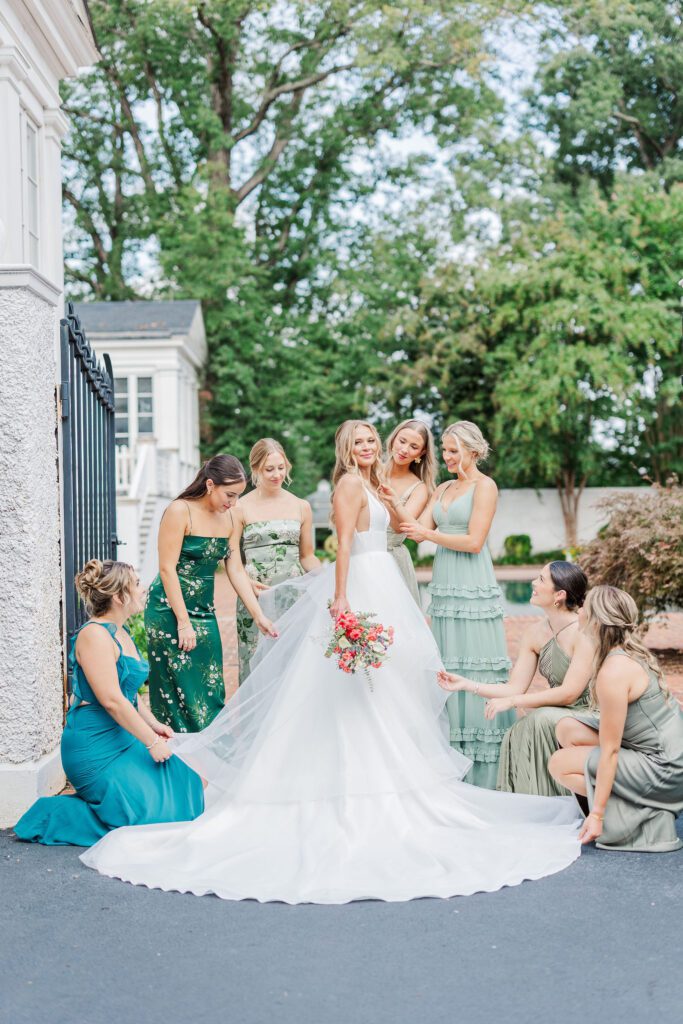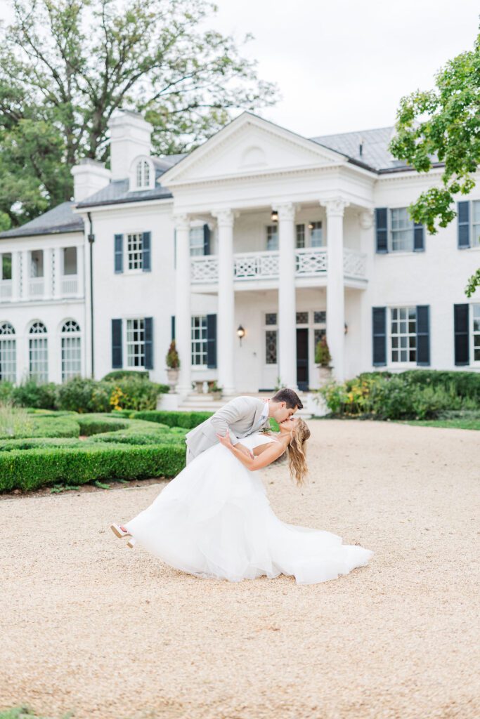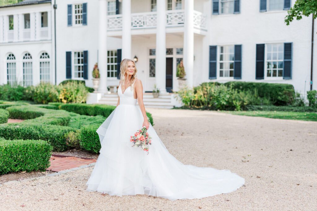 Their ceremony took place right in front of Keswick’s iconic white mansion. Rows of white chairs lined the gravel path, all facing the grand columns and fountain. As Haley walked down the aisle, there wasn’t a dry eye in sight. The scene was classic Virginia elegance — romantic, bright, and timeless.