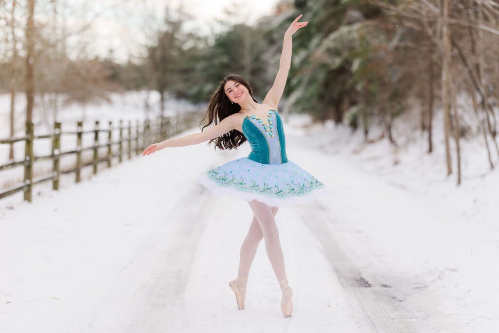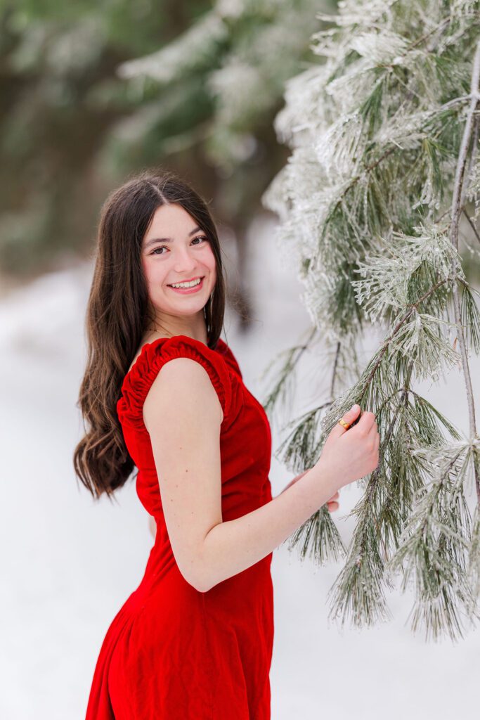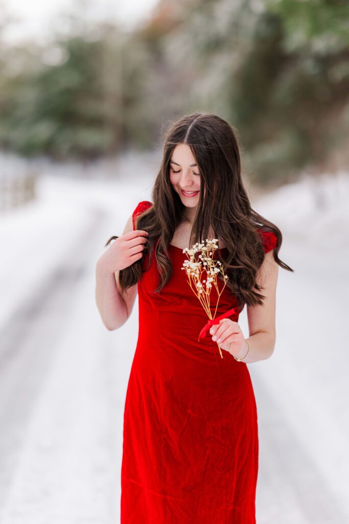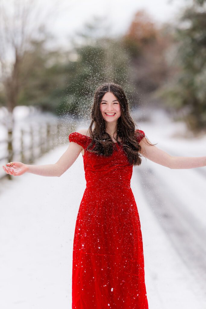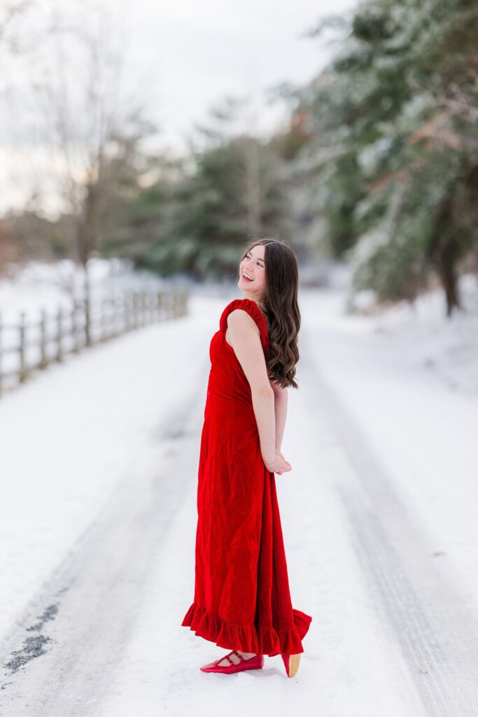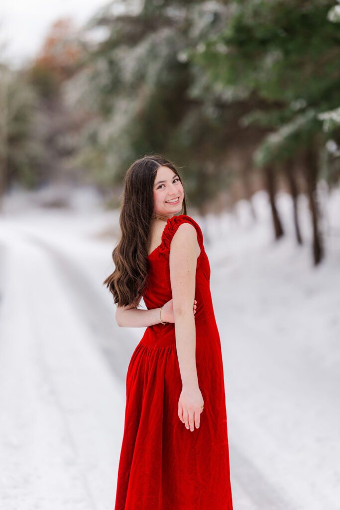 Her ballet portraits were especially special. Against the snowy backdrop, her poses looked so graceful and timeless — like something straight out of a winter fairytale. Then she changed into her red dress, adding the most striking pop of color against the white snow. And finally, we wrapped up with her casual look, capturing that laid-back, joyful energy that makes senior sessions so fun and real.